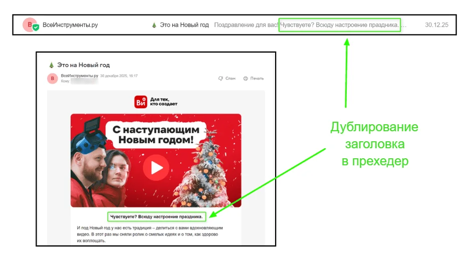 Важное дополнение: не стоит забывать и о заполнении прехедера — текста, который во входящих отображается следом за темой письма. Если это поле останется пустым, почтовый клиент автоматически подтянет заголовок в строку предпросмотра. В результате пользователь увидит заголовок еще до открытия письма, что лишит его смысла внутри сообщения и сделает вёрстку в списке входящих избыточной.
