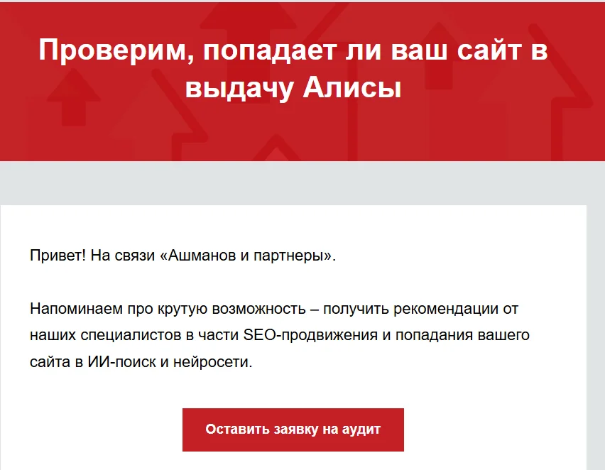 В идеале заголовок содержит главную мысль всего письма. Он формулирует ключевой посыл так, чтобы даже при беглом просмотре пользователь сразу понял суть предложения.