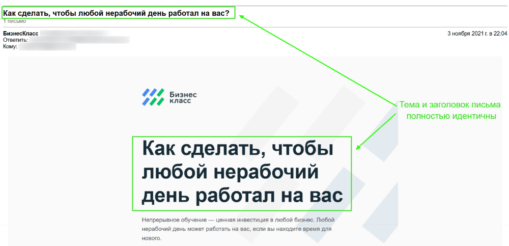 Важно! Избегайте прямого дублирования элементов. Заголовок, который повторяет тему слово в слово — это тавтология, которая не несет новой информации. Используя одинаковый текст, вы упускаете возможность лишний раз зацепить внимание читателя и дать ему дополнительный повод изучить письмо.