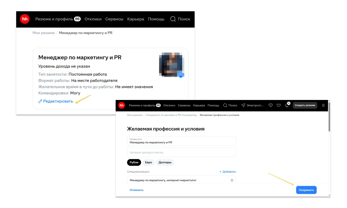 Дата последнего обновления. Резюме нужно регулярно обновлять. Можно не вносить никаких изменений, а просто нажимать «Редактировать» → «Сохранить». Чем актуальнее дата обновления, тем выше резюме отображается в списках работодателей.