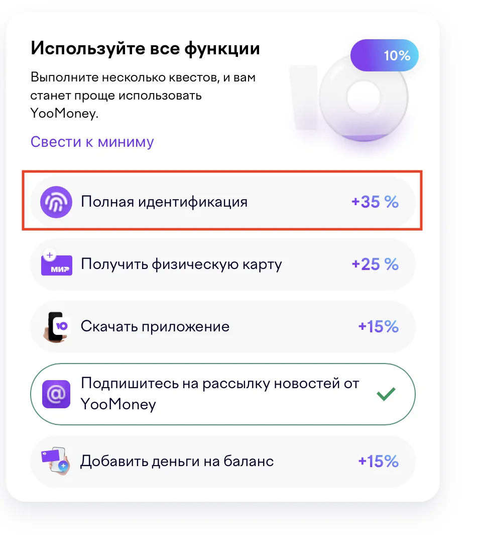 Идентифицированный кошелек — аналог полноценного платежного инструмента. Чтобы его открыть, нужно пройти полную проверку личности. Это можно сделать, загрузив фото паспорта через личный кабинет, подтвердив данные через «Госуслуги» или обратившись в офис платежной системы. После подтверждения вы получаете максимум возможностей: неограниченные переводы, снятие наличных до 100 тысяч рублей за раз, хранение до 600 тысяч рублей на счете, работа с валютой и дополнительные финансовые возможности. Такой кошелек подойдет тем, кто активно пользуется электронными деньгами: фрилансерам, онлайн-продавцам, тем, кто ведет расчеты с клиентами и партнерами.