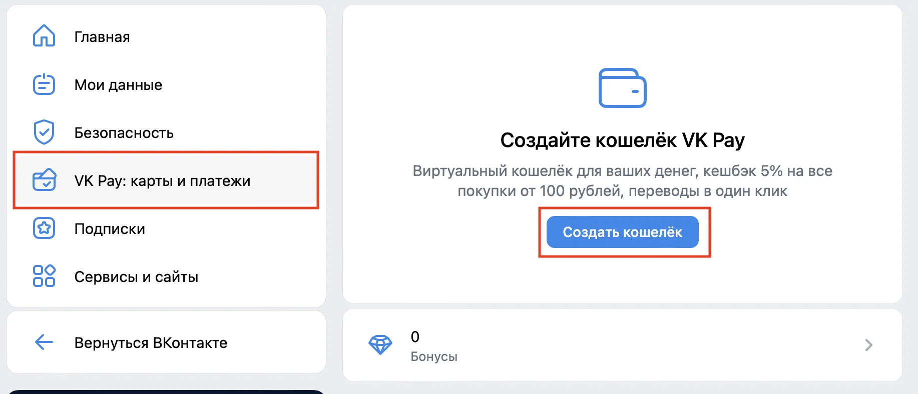 Оформить кошелек просто: зайдите в раздел VK Pay в приложении или на сайте и нажмите «Создать кошелек». Затем надо будет подтвердить номер телефона — кошелек будет активен.