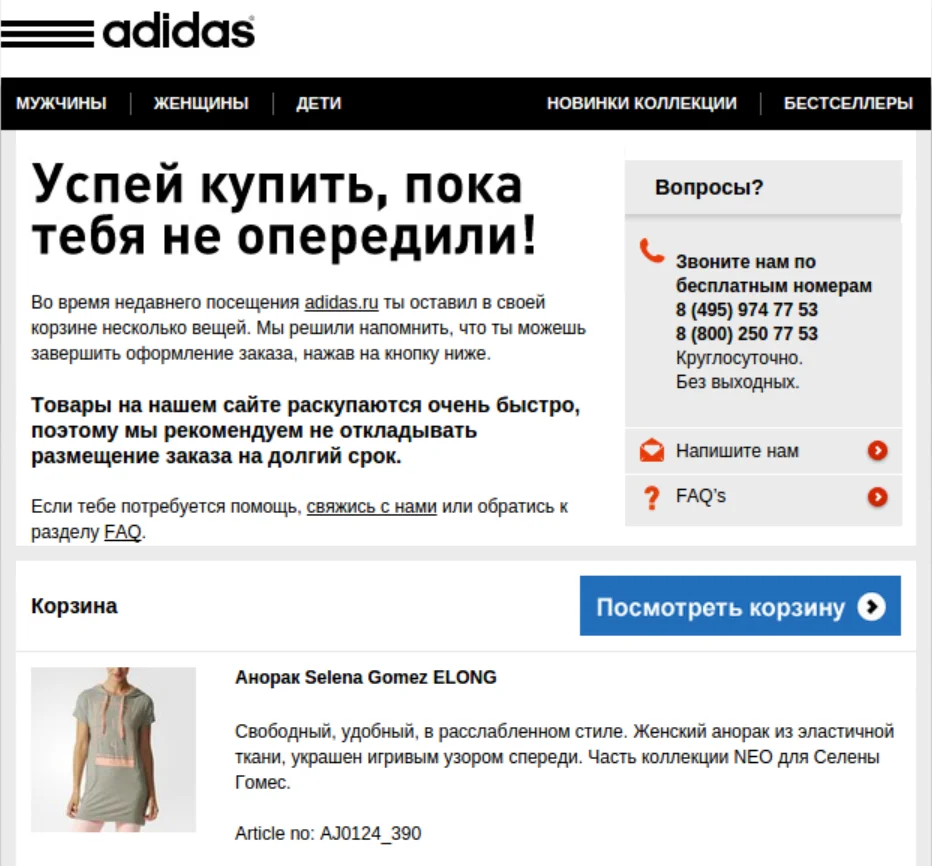 Пример. У Adidas — соревновательный дух прям в email-рассылке о брошенной корзине. Компания не использует временные ограничения и не создаёт дефицит товаров. Адресат видит только ненавязчивое напоминание о том, что товары раскупают очень быстро и можно не успеть, если долго думать.