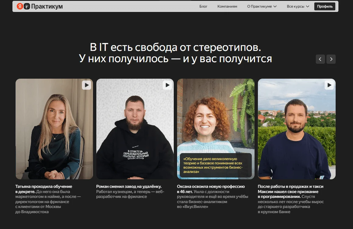 Пример. Яндекс Практикум делится положительными отзывами студентов и тем самым уменьшает сомнения тех, кто пока не воспользовался услугой. Причём истории рассказываются самые разные, чтобы показать, что у них может учиться каждый: кто-то прошёл курс и ушел с завода, кто-то в декрете сменил профессию, а кто-то начал всё с нуля в 47 лет.