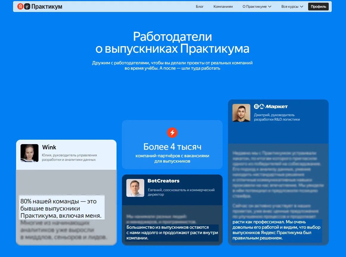 Ещё пример ― у Яндекс Практикума есть раздел с отзывами работодателей. Это очень привлекательно для студентов, потому что создаётся ощущение ― если я отучусь на этом курсе меня тоже могут взять на работу. Причем отзывы оставляют руководители крупных компаний вроде Яндекс Маркета и Wink.