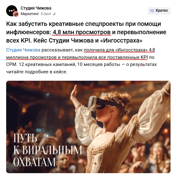 Пример. Тут отлично подходит формат кейсов. Можно рассказать, за счет чего получилось добиться крутого результата. При этом в кейсе можно и нужно давать реальные метрики — они вызывают больше доверия.