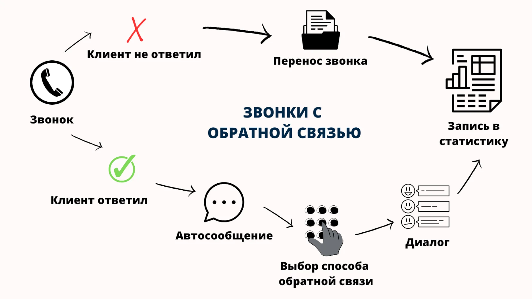Преимущество звонков с обратной связью в том, что сценарий можно разработать под любые задачи. Однако от абонентов в этом случае потребуется больше действий — отвечать на вопросы, выбирать направление беседы.