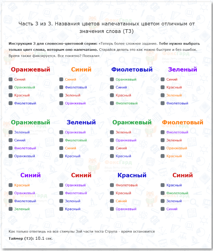 Тест состоит из нескольких этапов, в течение которых вам нужно выбирать или называть элементы, которые соответствуют заданным условиям. При этом нужно игнорировать второстепенные, нерелевантные детали.