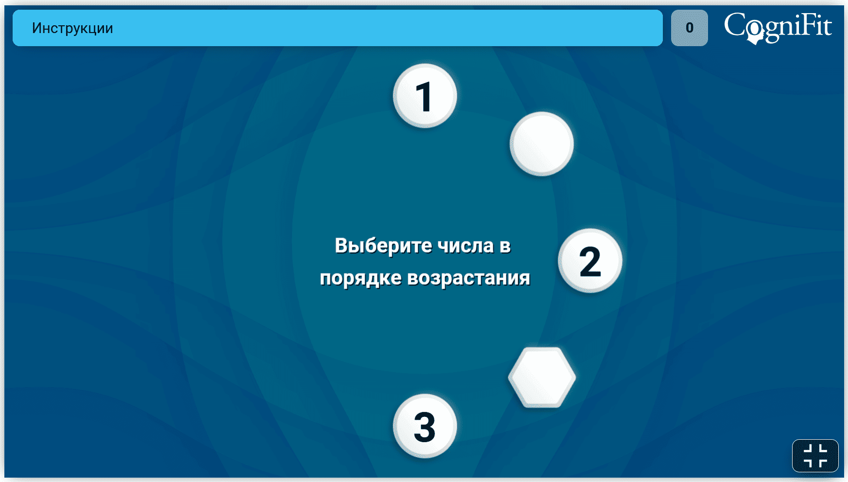 Тест предполагает три этапа, в течение которых нужно выбирать круги с числами в порядке возрастания. Дополнительную сложность создаёт показ фигур иных форм, как пустых, так и с цифрами или буквами.