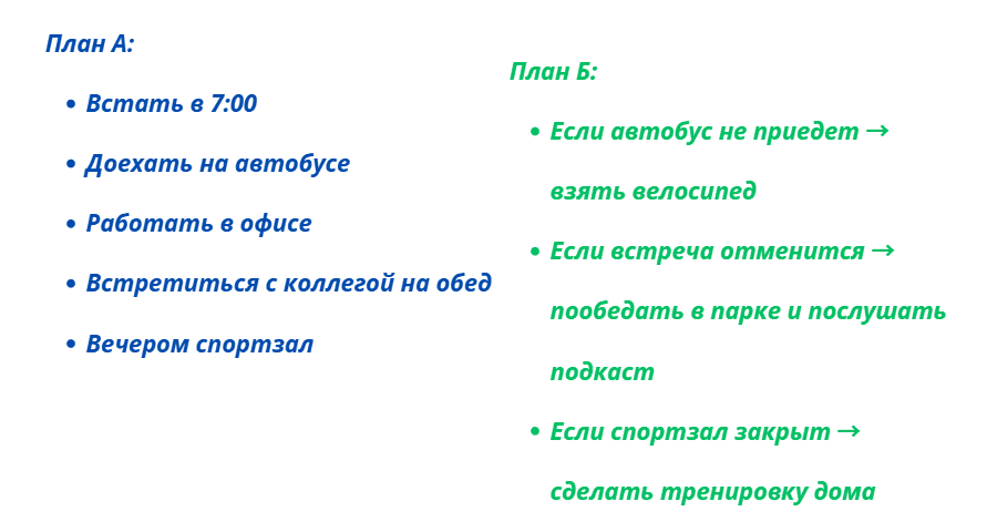 Возьмите за правило всегда продумывать и предполагать всевозможные развития событий, их последствия и способы решения внезапных проблем. Для начала вы можете потренироваться на прошедших событиях. Например, «а что бы я сделал, если…». Постепенно начните применять эту привычку относительно будущих планов. Заранее создавайте запасной план, даже если никаких неожиданностей не предполагается.