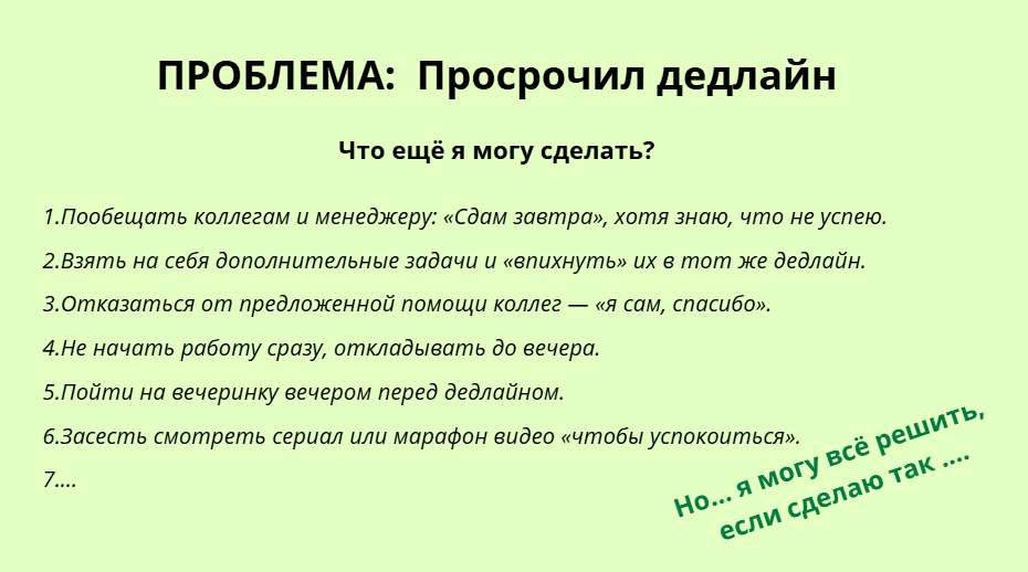 Выберите проблему и попытайтесь придумать как можно больше вариантов её усугубить. Затем найдите решение для каждой негативной ситуации. Это упражнение помогает посмотреть на проблемы с разных точек зрения.