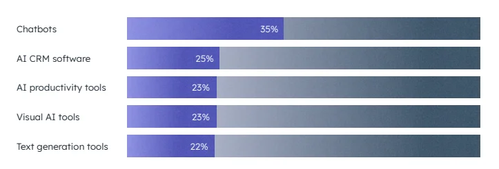 Искусственный интеллект как инструмент. По исследованию HubSpot более чем 74% маркетологов верят, что к 2030 году большинство людей будет использовать ИИ в работе. Наиболее популярным маркетинговым инструментом отмечают, например, чат-ботов, нейросети для генерации текста и визуала.