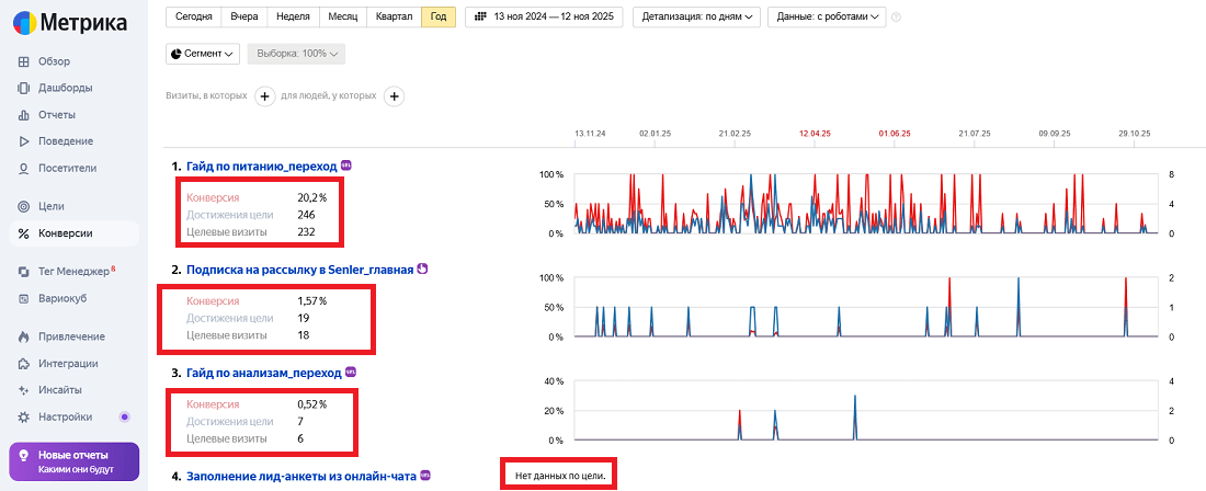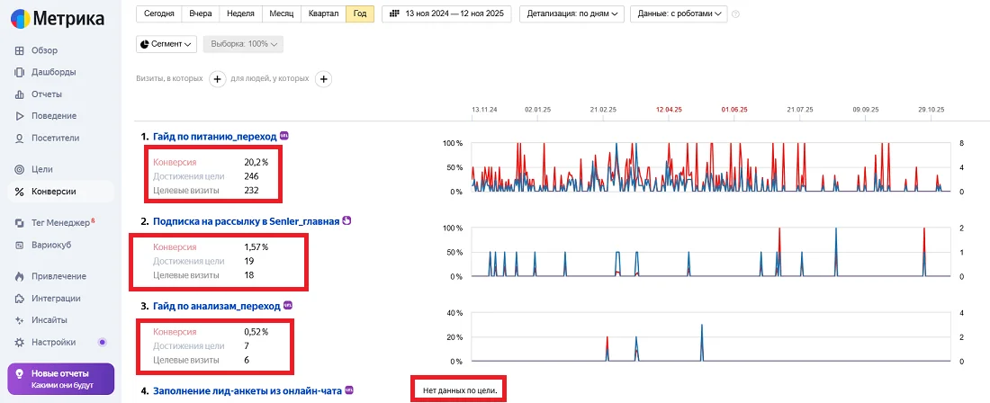 Конверсию разных этапов воронки можно определять с помощью сервисов веб-аналитики, сквозной аналитики и инструментов CRM-системы. Например, базовые отчеты Яндекс Метрики показывают конверсию верхней и средней части воронки, если у вас настроены цели.
