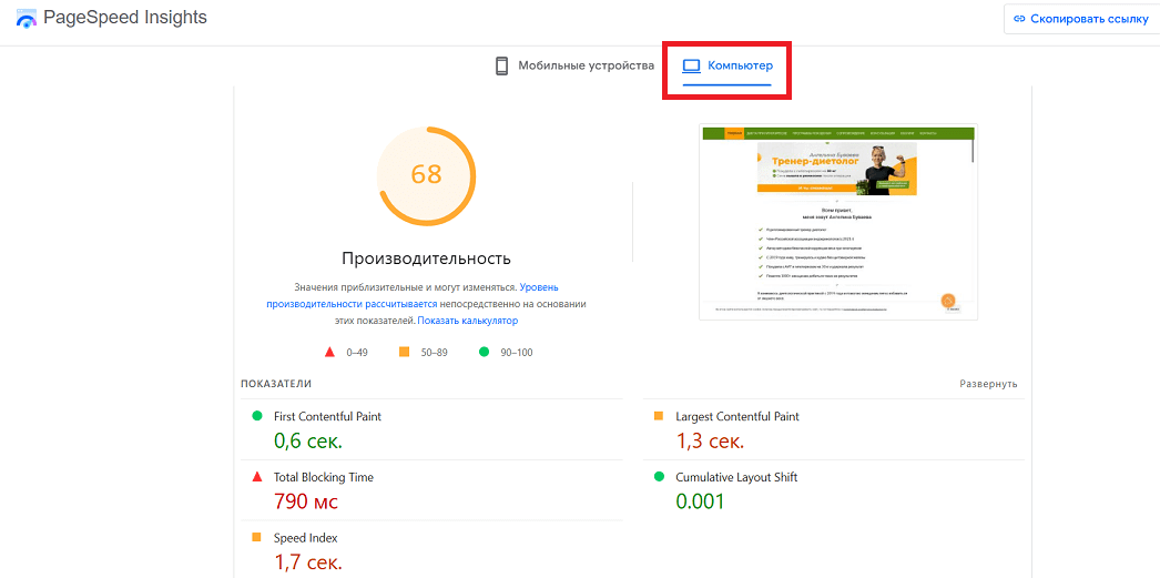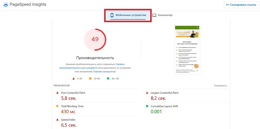 Проверить скорость загрузки можно в сервисе Google PageSpeed Insights. Просто введите URL вашего сайта и посмотрите, как долго страницы грузятся в мобильной и в десктопной версии.