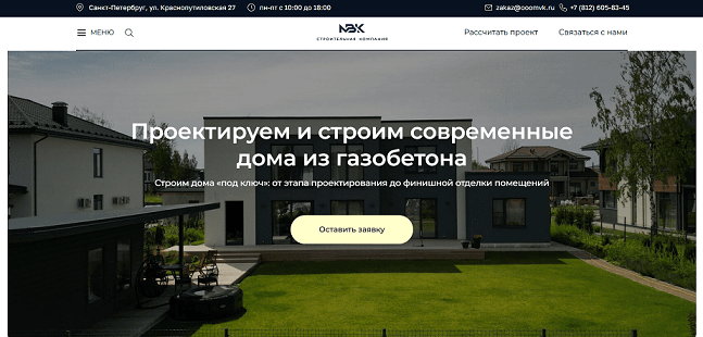 Ниже — пример хорошего описания на сайте строительной компании. При беглом взгляде на первый экран становится понятно, что подрядчик оказывает услуги под ключ: клиенту достаточно заключить договор и внести оплату, а компания подготовит проект, построит дом и сделает финишную отделку.