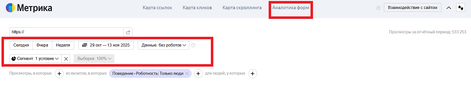 Чтобы понять, на каком этапе пользователи чаще всего «срываются», настройте цели в Яндекс Метрике и посмотрите отчет «Поведение – Аналитика форм». Сервис собирает и визуализирует данные за последние две недели. Такого среза будет достаточно, чтобы сделать вывод, какие поля формы снижают конверсию в заявку и что нужно сделать для улучшения этого показателя.