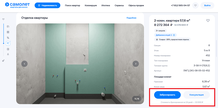 ГК «Самолет» действует иначе: на сайте есть полная информация о квартире, планировки и фото реальной отделки, предварительные расчеты при покупке в ипотеку. Призывы к действию другие — забронировать или запросить консультацию.