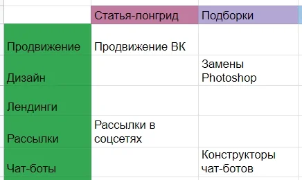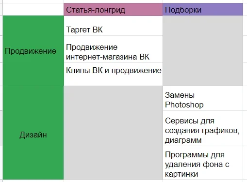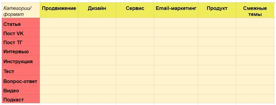 На пересечении категорий и форматов заполняю ячейки — можно включать сюда любые идеи, темы, ключевые фразы.