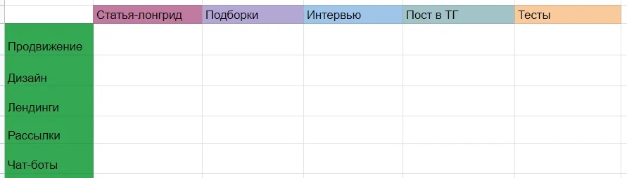Составлю простую матрицу в Google Таблицах. В верхней строке укажу форматы публикаций, а в первом столбце — категории или примеры направлений для тем.