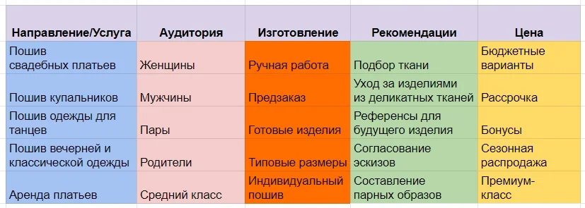 Сегменты ЦА. Если продукт или услуги компании рассчитаны на разную аудиторию, разделите ЦА по возрасту, полу, географии и пропишите идеи для каждого сегмента.
