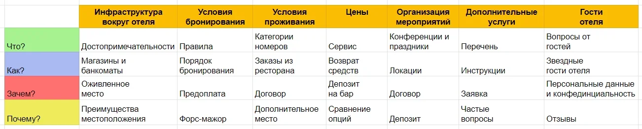 Ещё один вариант: в первый столбец записать вопросительные слова, в строку сверху — категории. В столбцы с категориями включить идеи и ключевые фразы. На пересечении ключа категории и вопросительного слова придумать варианты для тем.