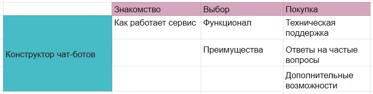 Воронка продаж. Сегментируйте идеи для контента по этапам пути клиента: клиент ничего не знает об услуге, узнал об услуге только что или уже пользуется услугой. Детализируйте категории по необходимости.