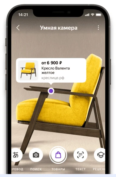 Распознавание объектов. Системы идентификации лиц анализируют людей по внешним параметрам: форме носа и губ, цвету глаз, овалу лица. Такие технологии применяют в аэропортах для ускорения паспортного контроля, в офисных зданиях для доступа сотрудников, в поисковых системах. Например, умная камера в приложении Яндекс распознает объект на фото, выдает краткую информацию о нем или ссылку на похожий товар в маркетплейсе.