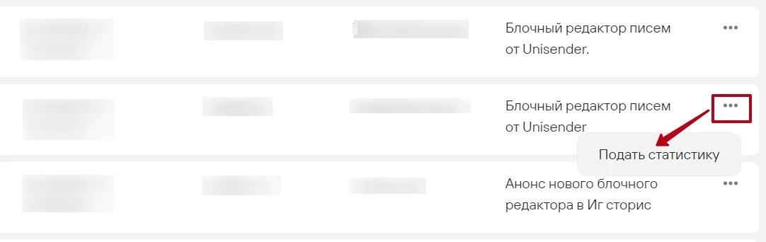 Чтобы добавить статистику по конкретному рекламному размещению, перейдите на вкладку «Креативы» и выберите в списке нужную строку. Нажмите три точки для вызова дополнительных опций, далее «Подать статистику».