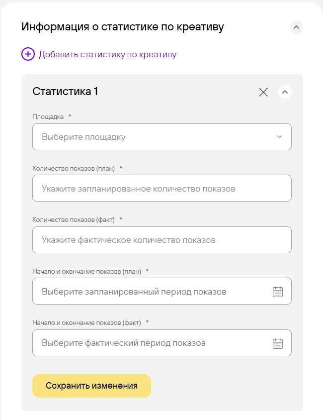 После этого откроется информация по креативу, а ниже будет опция «Добавить статистику по креативу» — в открывшемся окошке заполните обязательные строки.