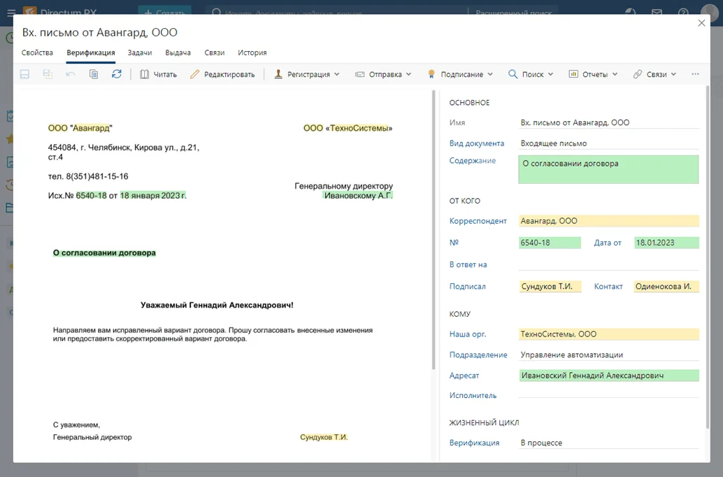Особенность — развитый искусственный интеллект. Он помогает с рутинными задачами: классифицирует документы, когда их заносят в систему, и извлекает реквизиты. Еще он умеет сравнивать разные версии документов и создавать поручения на основе протокола совещаний и приказов. Сотруднику остается лишь проверить, все ли данные заполнены верно.
