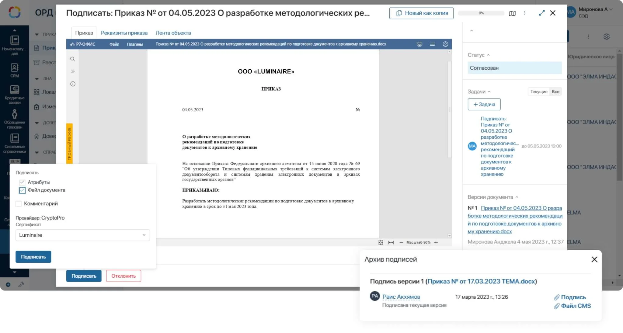 Доступна интеграция с КриптоПро — для подписания документов в системе. Можно настроить интеграцию с операторами ЭДО. В системе есть конструктор для построения схем движения документов и выбора шаблонов маршрутов — исходя из типа организаций, которые участвуют в документообороте.