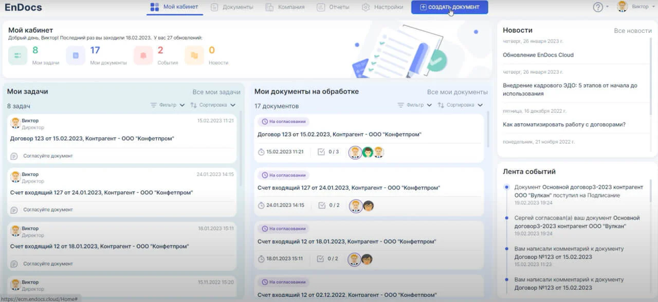 В EnDocs можно вести все делопроизводство: создавать и согласовывать документы — договоры, счета, приказы и распоряжения. А также подписывать кадровые документы, организовать электронный архив. Система интегрируется с Контур.Диадок и 1С, поддерживает работу с электронной подписью. Есть мобильное приложение.