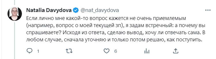 Как мы и сказали выше — нужно вести себя спокойно, быть доброжелательным и сдержанным. Некоторые айтишники рекомендуют не бояться каверзных вопросов и задавать встречные. Например, если вас спрашивают о зарплате, можете уточнить, для чего нанимателю эта информация.