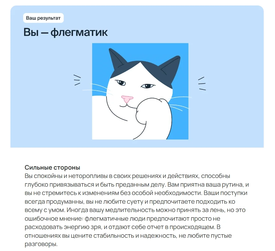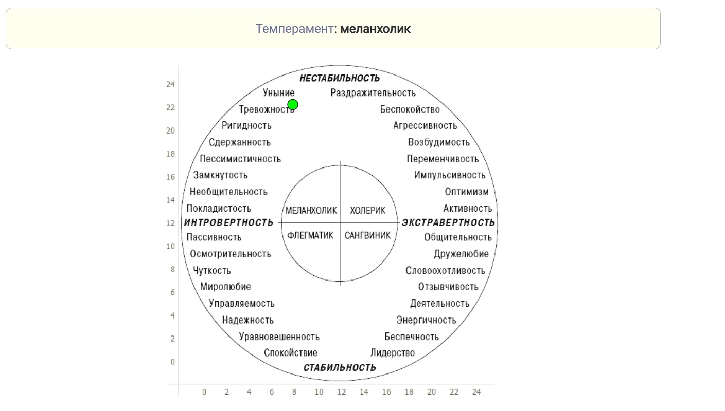 Тест на темперамент от команды практикующих психологов «Ясно» — выявляет вид темперамента на основе 24 характеристик. Нужно выбрать те, что лучше всего вас описывают. После прохождения теста можно обсудить результаты с психологом команды.