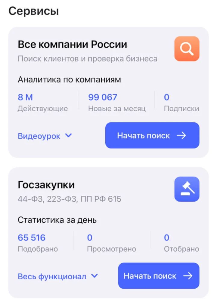 Также есть разбивка компаний на категорию сервисов. Например, можно найти тендеры для госзакупок, торги по банкротству или объявления с продажей муниципального имущества.