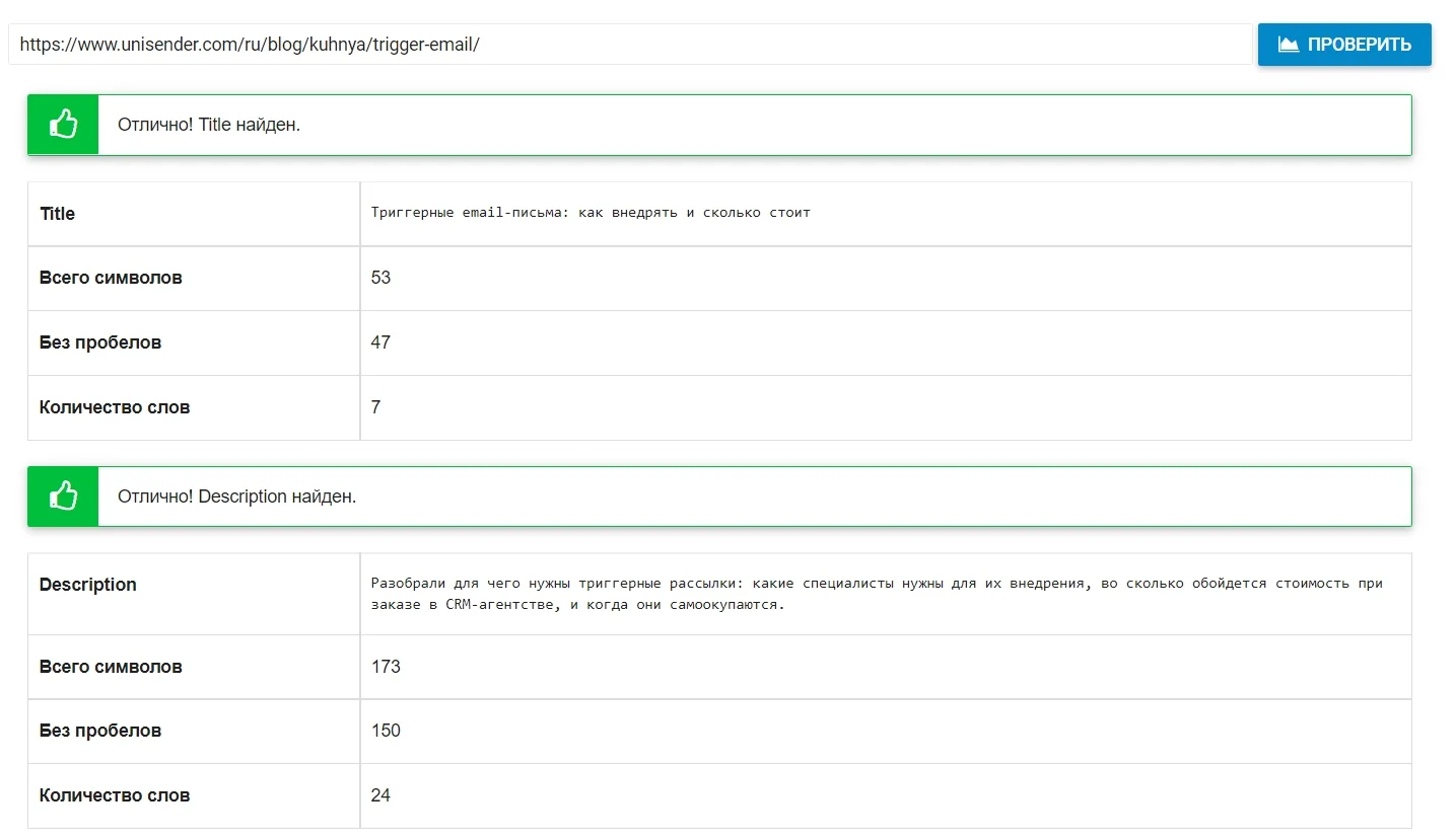 Вставляем в поле URL ссылку на сайт и запускаем проверку. В рабочей зоне есть несколько вкладок. Нужные нам — «title» и «description».