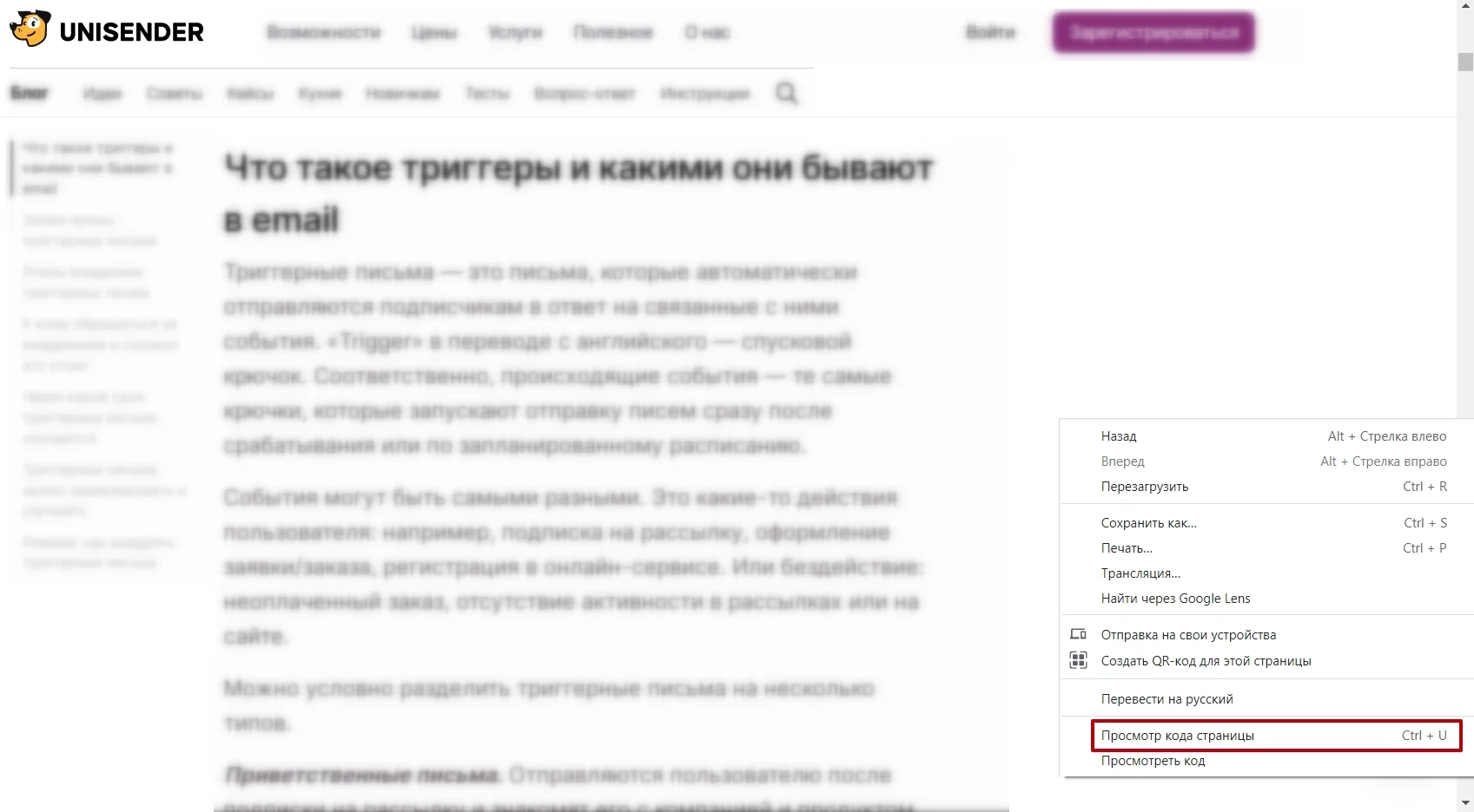 Другой вариант — кликаем правой кнопкой мыши на страницы и выбираем «Показать исходный код страницы»/«Просмотр кода страницы».