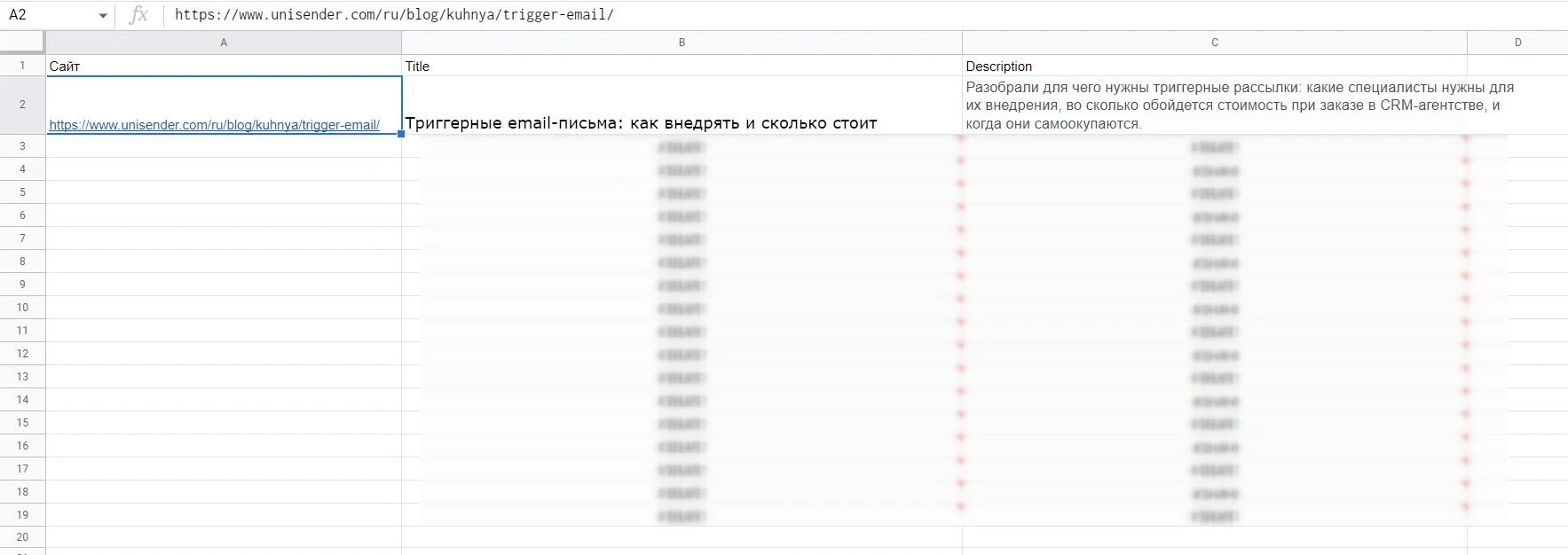 Если не хотите самостоятельно делать таблицу, копируйте нашу с готовыми формулами. Вам останется только вставить URL, а Title и Description загрузятся автоматически.
