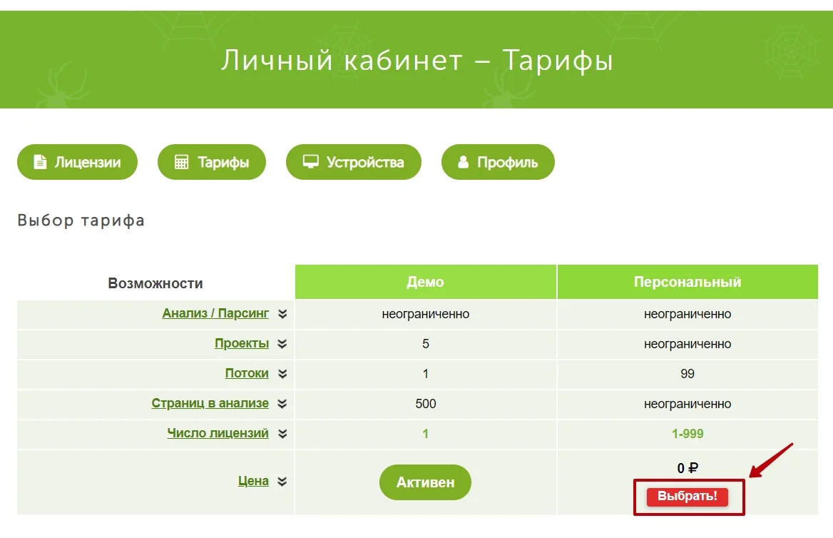 Чтобы работать с программой, сначала зарегистрируйтесь на сайте и перейдите в раздел «Тарифы».