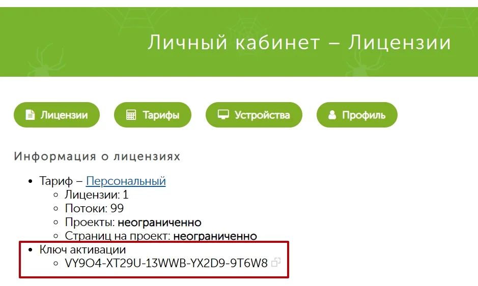 Потом зайдите в раздел «Лицензии» и скопируйте ключ активации.