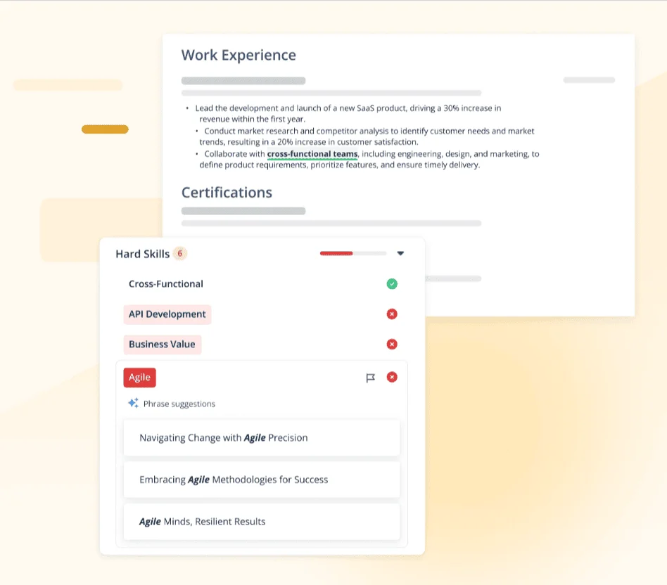 Jobscan. Продвинутый AI-инструмент для оптимизации и анализа резюме под ATS-системы. Предлагает сравнение резюме с вакансией, оптимизацию текста, шаблоны резюме и сопроводительных писем, инструменты для LinkedIn и встроенный трекер заявок. Бесплатный план ограничивает число сканов в месяц до пяти, платный (около 4000 ₽ в месяц) предоставляет неограниченный доступ к функциям.
