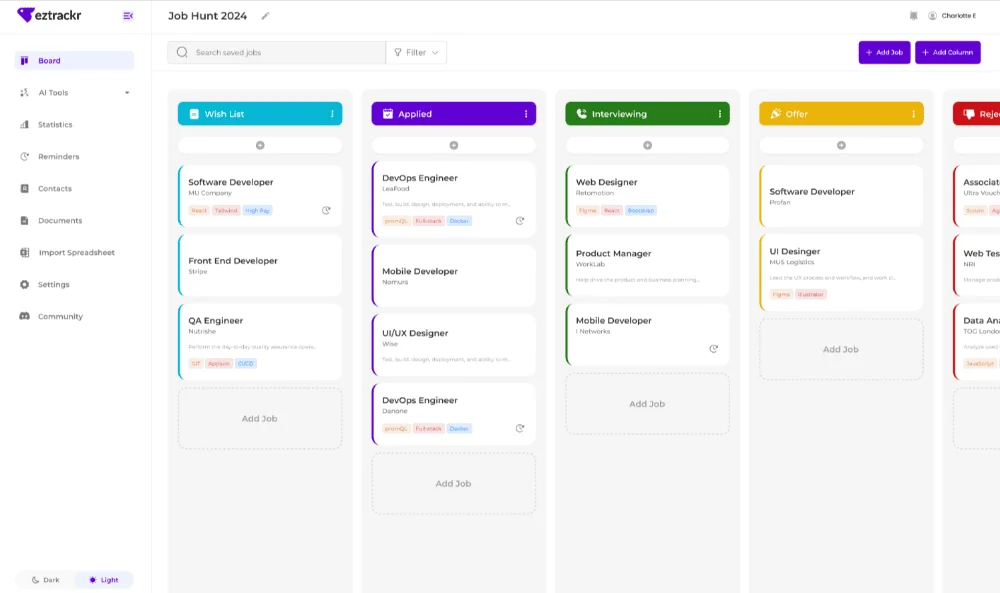 Eztrackr. Удобный трекер с визуальным интерфейсом и встроенным Chrome-расширением. Позволяет добавлять вакансии в трекер в пару кликов, отслеживать статистику, вести Kanban-доску, а также использовать AI-функции: генерацию сопроводительных писем, анализ вакансий и оптимизацию резюме. Есть бесплатный тариф без лимита заданий для отслеживания.
