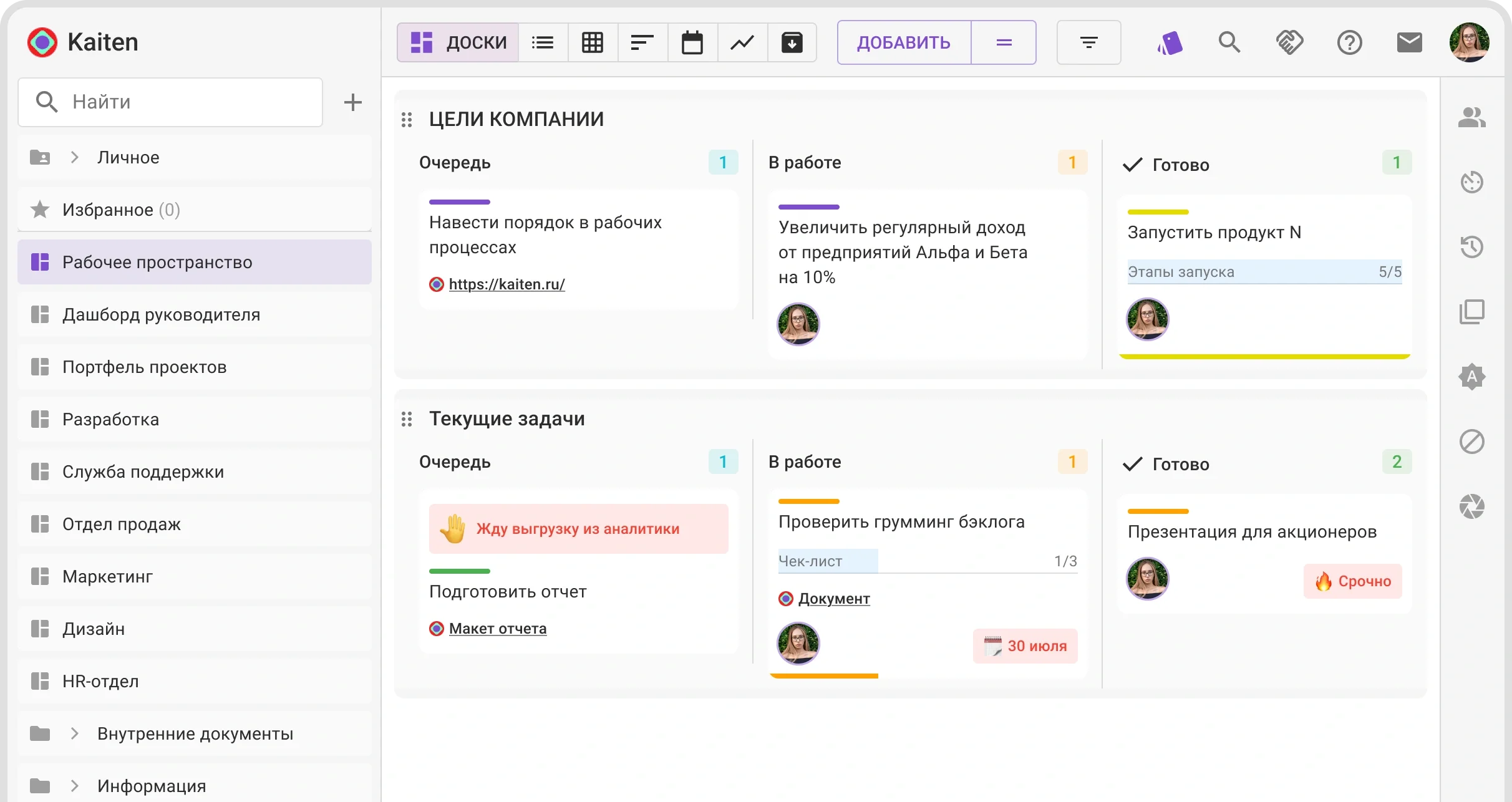 Сервис для командной работы над проектами. Внутри доска с задачами, полноценный мессенджер для общения, таск-трекер и база знаний — в нее можно загружать статьи и документы, которые нужны сотрудникам для работы.