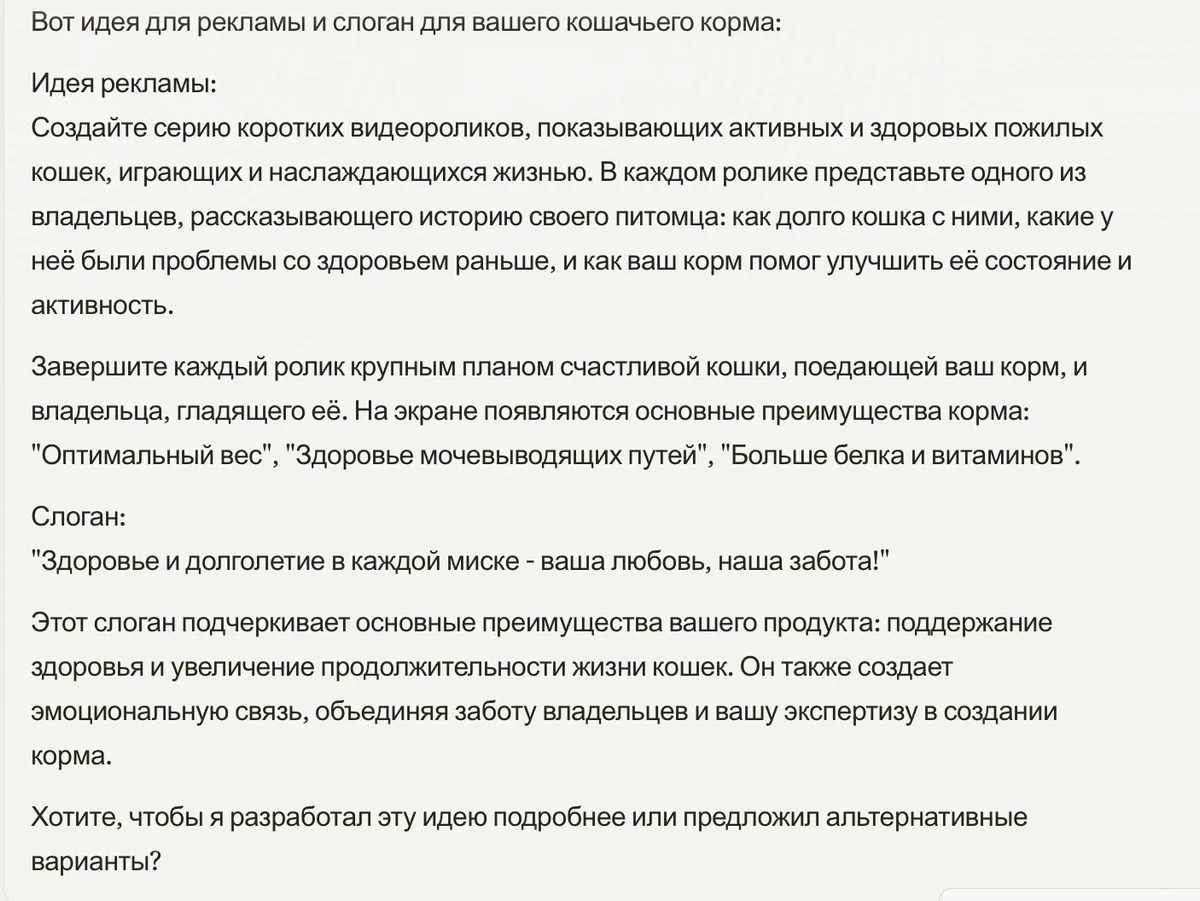 Креативность. Попросили нейросети написать идею для рекламного ролика кошачьего корма и придумать к продукту слоган.