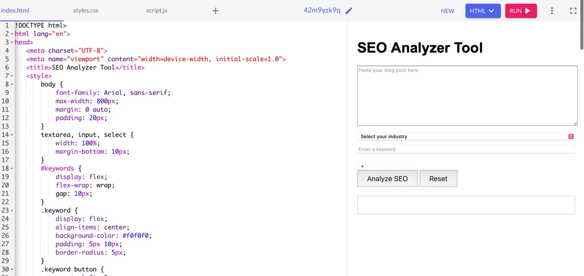 Создай инструмент SEO, который позволяет загружать блог-пост, указывать отрасль и ключевые слова. После загрузки информации, должна появится кнопка для анализа с подсвеченными предложениями по изменениям. Сделай кнопку сброса для начала процесса заново, а также кнопку добавления ключевых слов для возможности ввода нескольких ключевых слов. В области предложений по SEO после анализа предоставь конкретные цифры и статистику из блог-поста, а также предупреждающие знаки, указывающие на проблемные места.