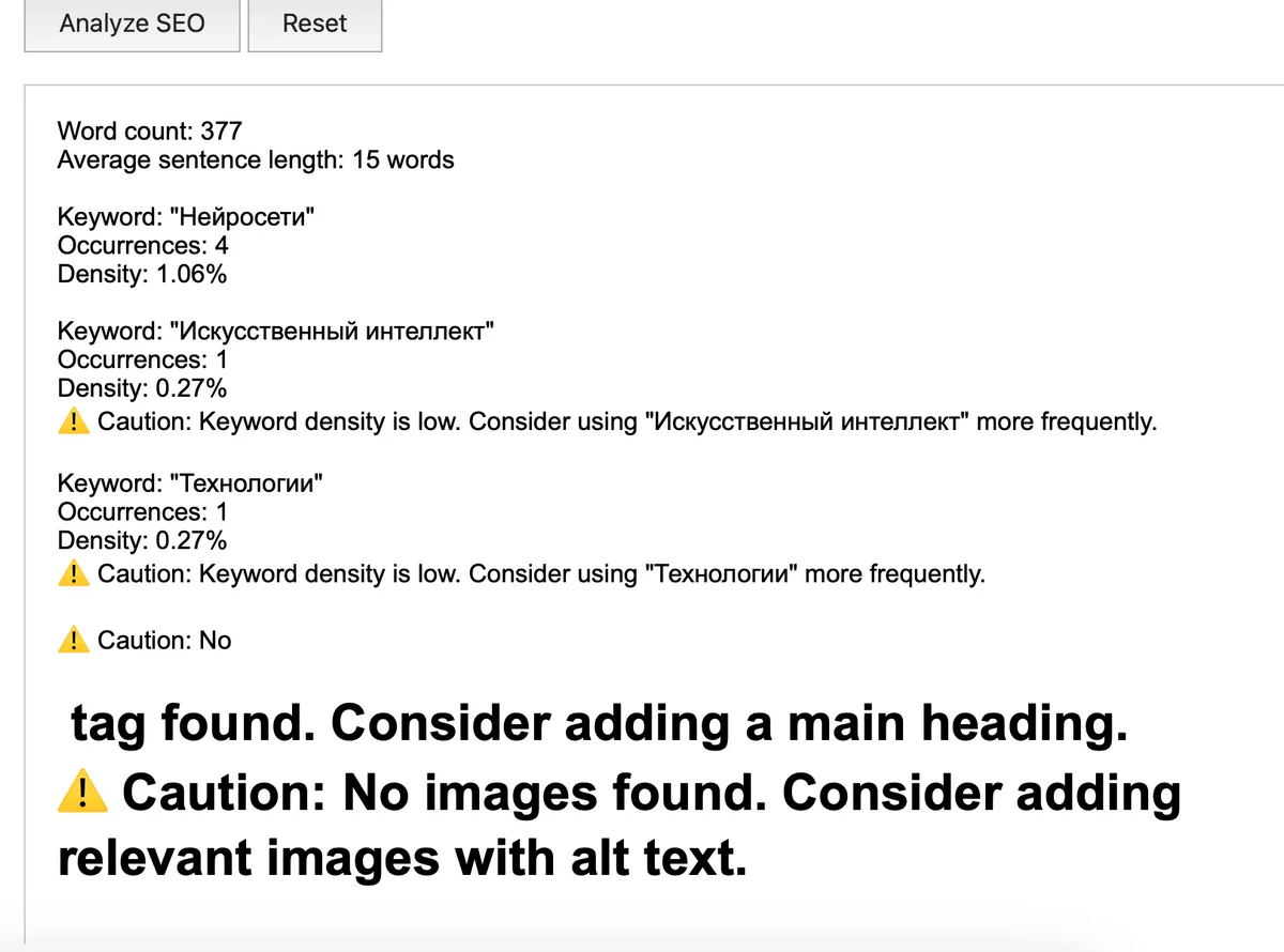 SEO-программа сработала так, как указано в промпте: проанализировала текст и подсветила недочеты.