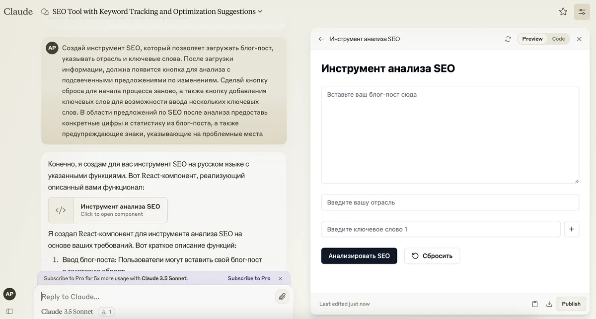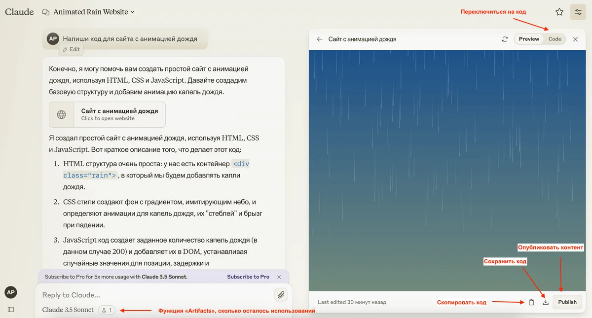 Но у Claude есть преимущество: код можно запустить в диалоге с помощью новой фичи Artifacts. А еще нейронка Anthropic создала интерфейс на русском в отличе от ChatGPT.