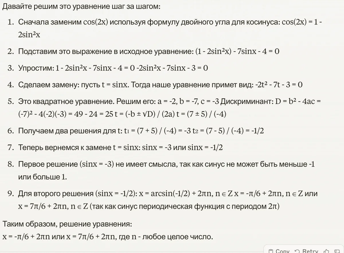 Решение математических задач. Загрузили в чат-боты тригонометрическое уравнение: cos(2x)−7sinx−4=0.