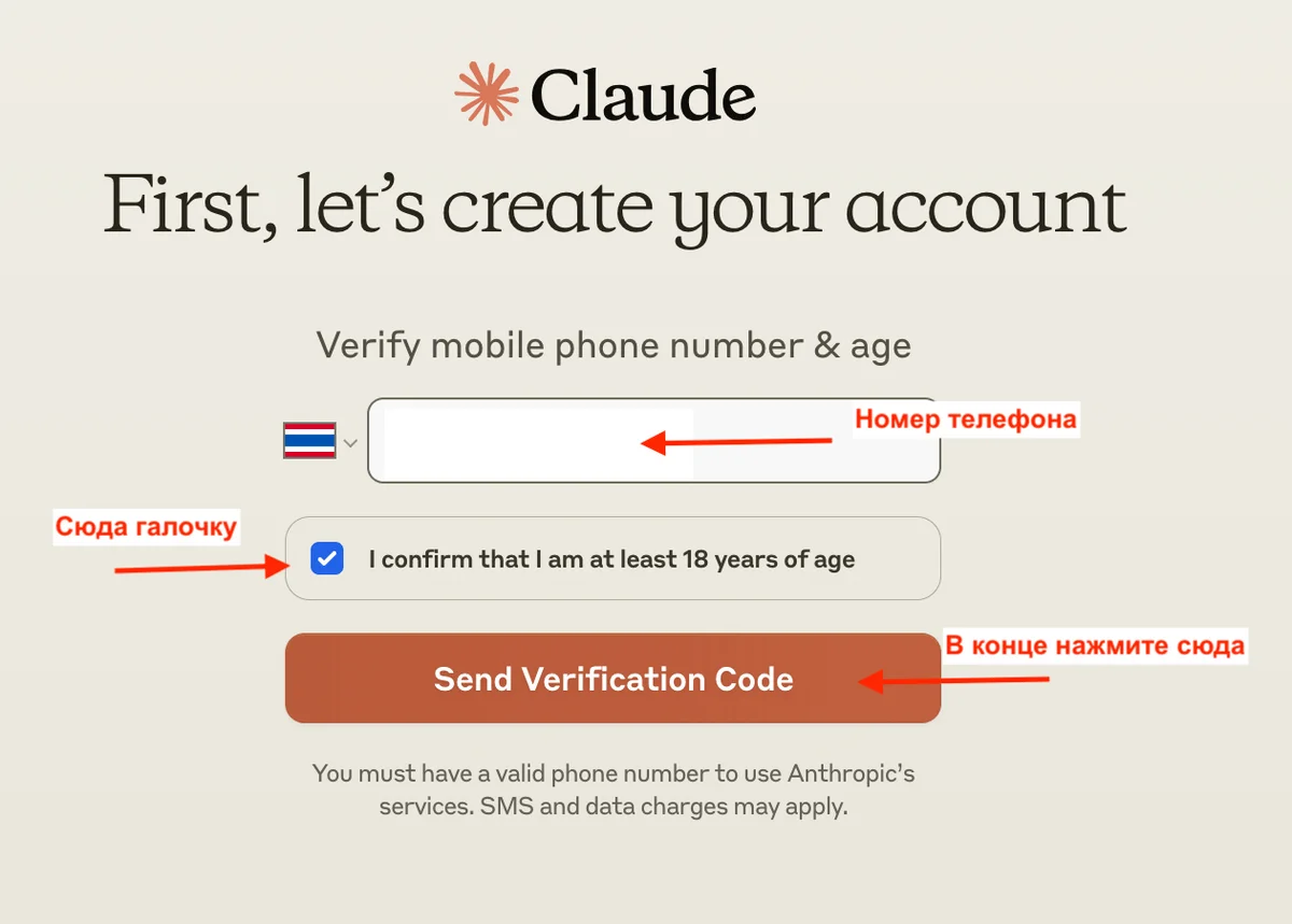 Введите зарубежный номер телефона, поставьте галочку, что вы старше 18 лет, и нажмите Send Verification Code. Для приема SMS можно купить иностранную eSIM или арендовать номер телефона.