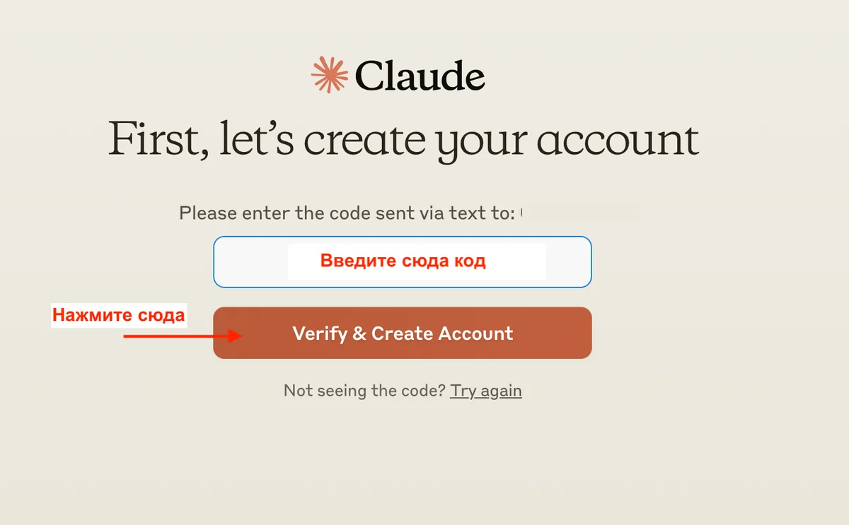 На телефон придет сообщения с кодом. Введите его в нужное поле и нажмите Verify & Create Account.